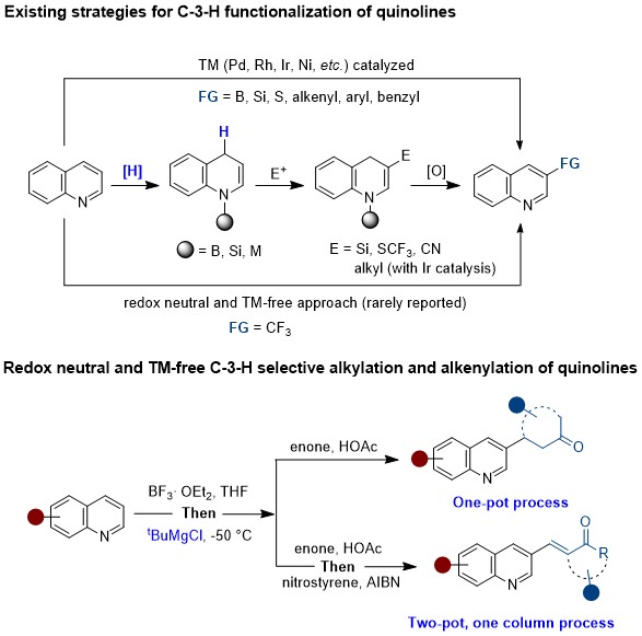 通过广泛的研究和理论计算,化学家们成功地开发了一系列高效的过渡金属催化剂和反应条件,以实现喹啉C3-H键的功能化。然而,这些方法有一些不可克服的局限性,如复杂的配体、环境污染问题、高温操作以及与溴化或碘化底物不相容。喹啉或吡啶的一种强大的C3-H键官能化策略是还原性去芳构化-重芳构化方法,通过1,4-还原性去芳构化反应形成二氢喹啉或二氢吡啶中间体,从而将最初缺乏电子的杂芳烃转化为富电子的烯胺中间体。这个方法主要问题是需要使用还原剂或氧化剂,而且需要预活化并分离去芳构化中间体。这些步骤可能会增加合成过程的复杂性和成本,同时也可能影响最终产物的纯度和产率。迄今为止,所有报道的方法都不能在氧化还原中性或无过渡金属的条件下实现喹啉3-位的烷基化或烯基化反应。