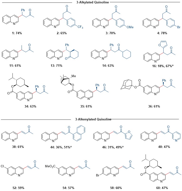 在最优条件下作者对该反应底物适用范围进行了考察。各种取代的喹啉和烯酮可以偶联在一起,以中等到较高的产率合成各种3-烷基化和烯基化喹啉,并且3-位取代的喹啉衍生物是唯一产物。官能团如酯,氰基,硝基,酰基,烷基,芳基,杂芳基和烷氧基都是可耐受的,在过渡金属催化条件下通常是不相容的卤素也是可耐受的。无环烯酮和环烯酮都能与喹啉类化合物顺利反应。该反应对电子效应不敏感,无论缺电子取代基还是富电子取代基,都能以高收率得到产物。烯基化反应中使用甲氧基取代的烯酮为底物,表现出了与烷基化反应类似的底物适用性。